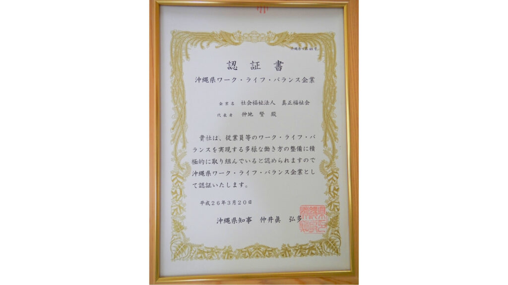 わたしたちは、ワークライフバランス認証施設として、仕事とプライベートのけじめをつけ、心にゆとりを感じられる、穏やかな労働環境の実現に取り組みます。