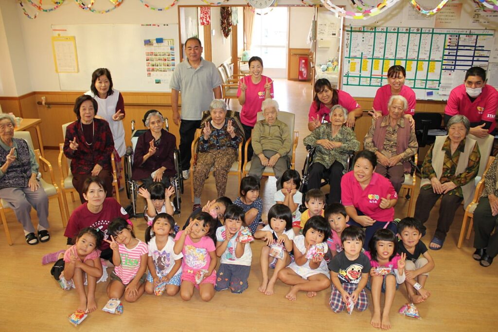 何時でも、どりーむはうすのおじいちゃんおばあちゃん達の暖かい笑顔でお迎え頂けるのがとても印象的です。今日は、普段練習しているエイサーと、1対1になって「はなれないふたり」のふれあい遊びをしました。最後にみんなではい、ポーズ♪