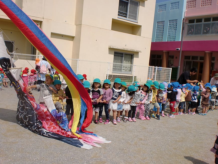 先生から鯉のぼりの由来を聞いた後、いよいよ、鯉のぼりが揚がります!!「わ~っ」と、みんなのテンションはMAXに!!