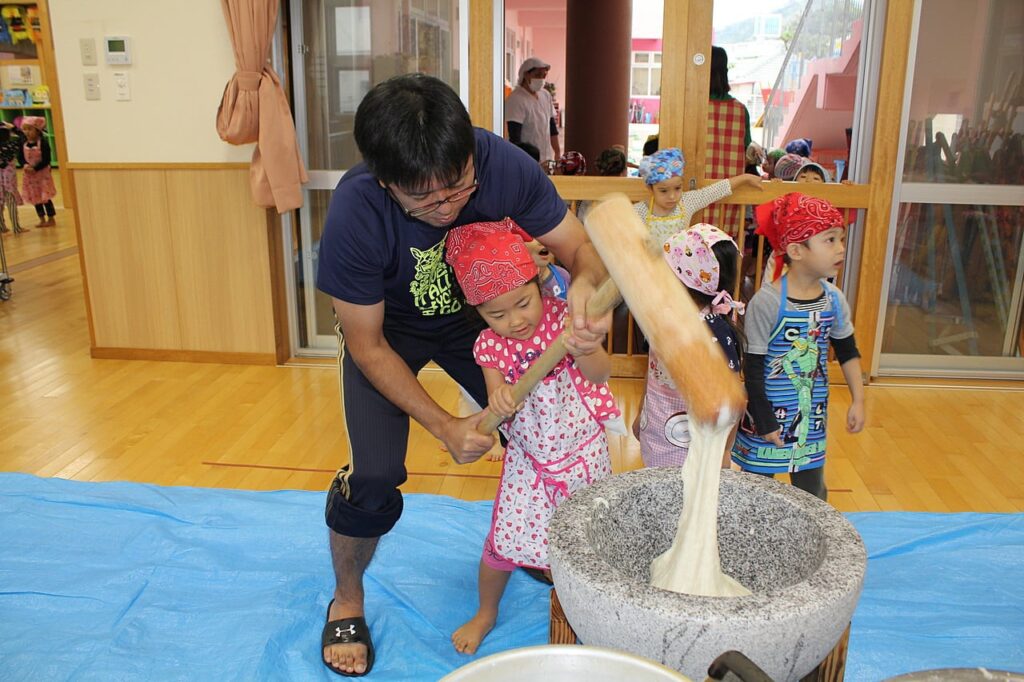 うさぎ組のみんなは、「よいしょ!よいしょ!」の掛け声でお餅をつきます。もっちりのび~るお餅を見て、子ども達も楽しそう♪とても楽しい餅つき会でした。