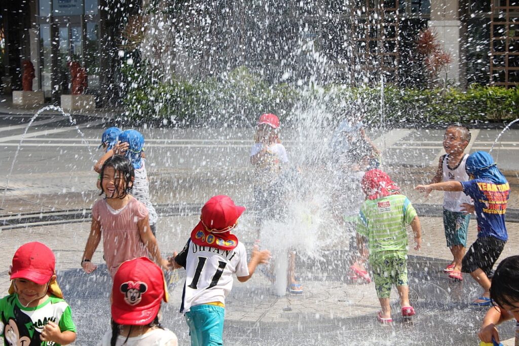 中央ゲート下の噴水広場にて、夏ならではの水遊びです‼