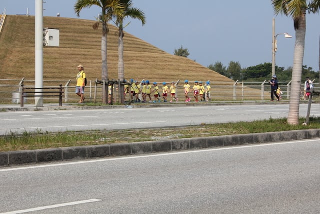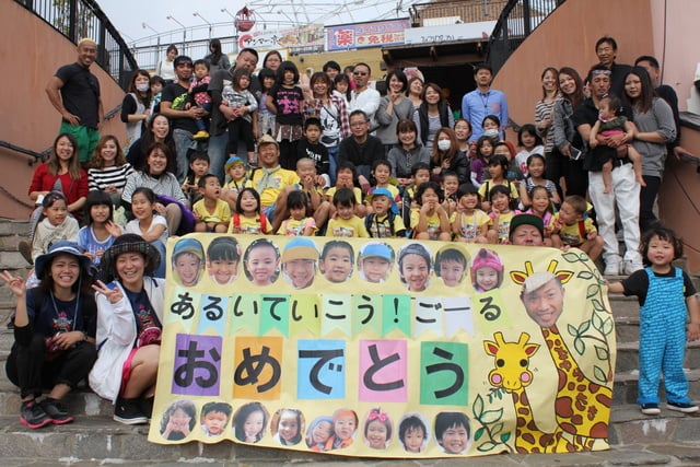 そう、3歳児クラスから続けてきた「あるいていこう!」最終回の今回は、嘉手納町兼久海浜公園から約5キロの道のりを南下、ゴールの北谷町「カーニバルパーク美浜」の大観覧車を目指し、子どもたちは元気に歩きました。そして…大勢の保護者が待つ現地にて感動のゴール‼中には、感動して感極まる保護者の姿も。子どもたちは、大好きなお父さんやお母さん、家族の方々とお約束の大観覧車に乗車しました。その後はご褒美のアイスをペロリ♪