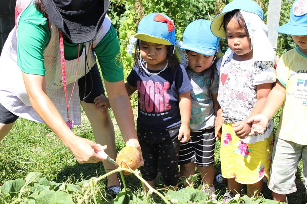 さて、今日もりす組さんにおじゃまして、久しぶりに美ら咲ファームへ行ってきました。畑のお引越しから数ヵ月、各クラスの野菜もどんどん大きくなっています。ゴーヤー、オクラ、なすび、その他…。夏野菜はもうすぐ終わりですがそんな中、今日は大きな赤ウリが取れました!!子ども達にはなじみの薄い赤ウリ。みんな珍しそうに眺めていました。