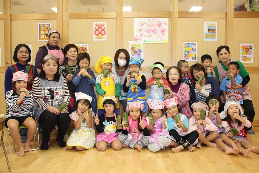 さて、今日は鬼ムーチー作り♪昨日みんなで準備したムーチーガーサー(月桃の葉)やもち粉など、準備万端!!おばあちゃん達も揃った所で、作業開始です。お餅をこねこねみんな一生懸命♪「見て見て~」と出来上がったムーチー片手に、大喜びの子ども達でした!!