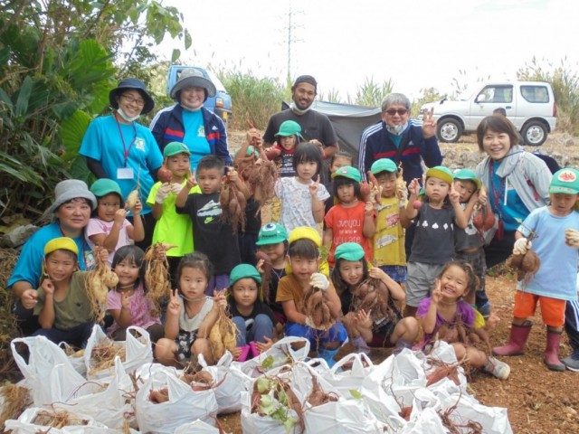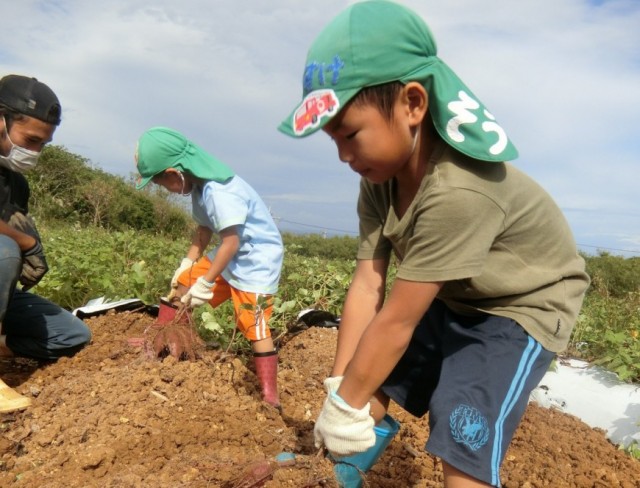 11月20日、保護者の浦崎直太郎くんのご両親のお計らいで、山川区にある浦崎家の芋畑でそら組20人が芋ほりに挑戦してきました。快晴のこの日、園児たちは畑のお芋を手袋をつけて一生懸命に堀り、自分たちの分だけでなく、他の全クラス、職員の分まで元気に掘ってくれました。土の中から大きなお芋がどんどん取れ、まるで大きな自然の宝箱のようでした。