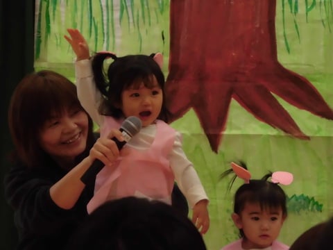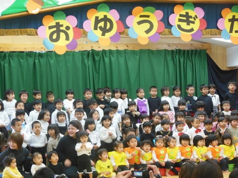子どもたちも楽しみにしていたお遊戯会が28日(土)9時半開始でご家族の見守る中行われました。朝からそわそわしていた子どもたちですが…皆本番に強い!(^^)! 舞台の上で泣く子もなく皆よく頑張りました。