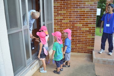子どもたちにとって給食サービスは、単にお弁当を持っていくだけでなく世代間交流の楽しいひと時です。おじいちゃんおばあちゃんとの愉快な会話は勿論、道すがらの先生たちとの会話やおじいちゃんおばあちゃんのお宅やお庭もわくわく出来る冒険タイムです。