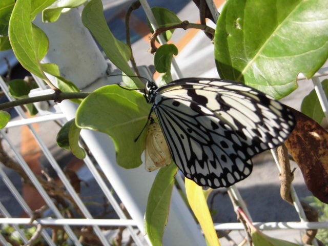 保育園前の花園に植えている食草にオオゴマダラの蛹が4個、そして今日の朝2個の蛹から孵化した蝶が旅立つ準備をしていました。その瞬間を4歳児の子ども達と一緒に蝶々の様子を見守りました。