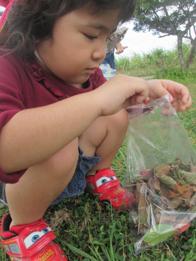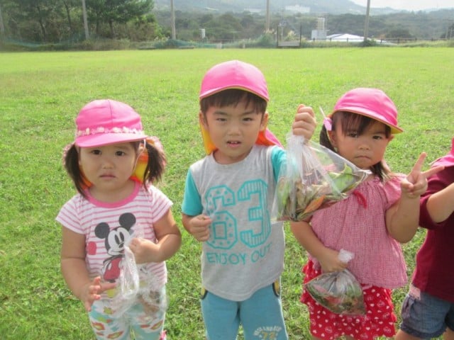 秋さがし 2017 11/13 風のわ保育園からのお知らせ 2歳児クラスのびのび組で謝花グランドへ秋さがしをしにいきました。 枯れた葉っぱや、松ぼっくり等を思い思いに拾い集め、ビニール袋一杯に詰めて帰ってきました。 「ただいま~、いっぱいとってきたよ~」と嬉しそうな声で教えてくれました。 拾ってきた葉っぱは、保育参観で制作にて使いました。さて出来上がりはどうだったでしょうか? 風のわ保育園からのお知らせ