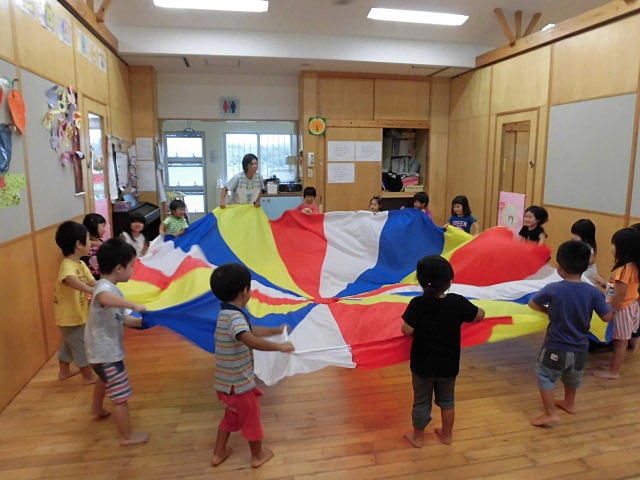 それも初めてのバルーン運動!右手は目印でシールをはりつけ、職員も子ども達も色々試しながら楽しんでました~。「シール張ってるとこが右だよ。今右手あげて~!」とか、「今はせんたくごしごし~」とか、これ以上は本番までのお楽しみです。