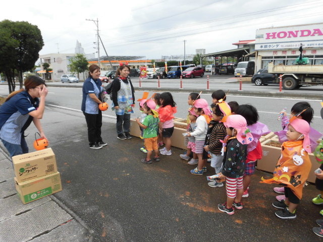 と、子どもたちで制作した、帽子やマントを身に着けて、ローソン浦崎店まで足を運びました。ローソン店長さんや保護者の方からお菓子を頂き、子どもたちも大喜びでした~!